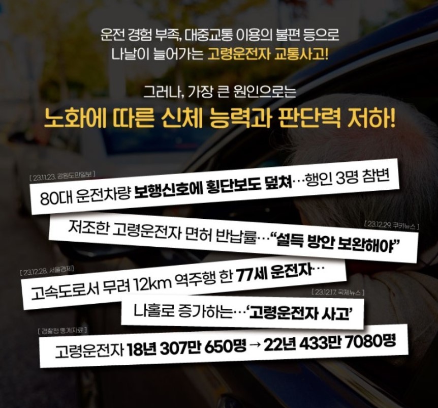 나이가 들수록 고령운전자의 반응속도, 운전자 시야각, 운동능력 등 신체적 능력이 현저히 떨어지기 때문에
