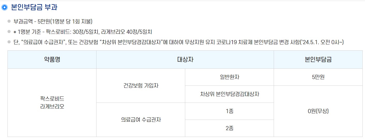 - 1명 기준 : 팍스로비니드 30정/5일치, 라게브리오 40정/5일치